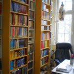 Ihr Arbeitszimmer ist vollgepackt mit Büchern, die Regale erstrecken sich weit nach oben.